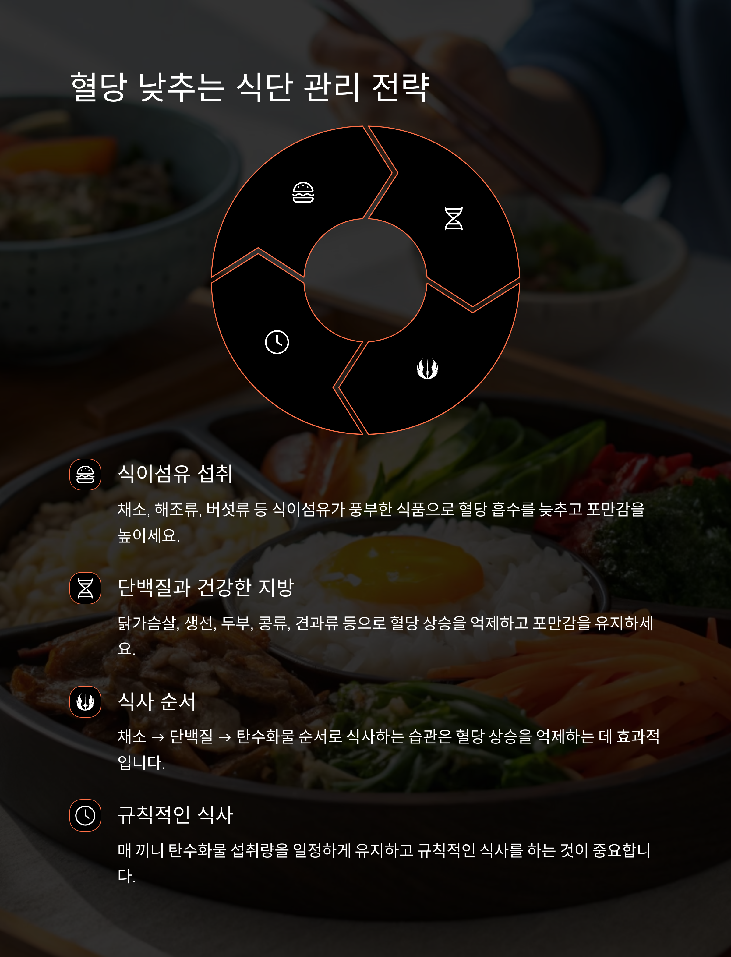 - 규칙적인 식사: 매 끼니 탄수화물 섭취량을 일정하게 유지하고 규칙적인 식사를 하는 것이 중요합니다.