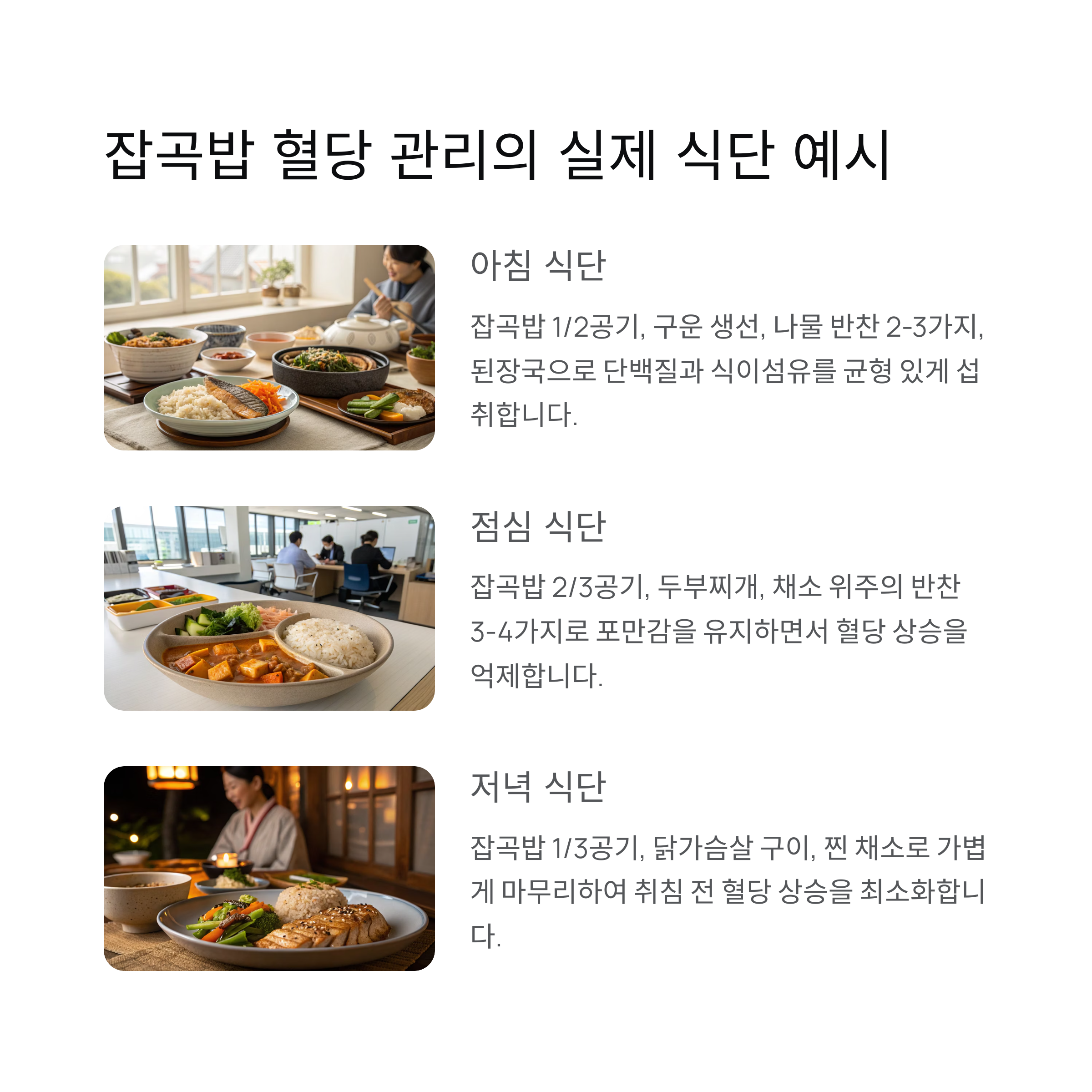 혈당 관리는 잡곡밥만으로 이루어지는 것이 아닙니다. 균형 잡힌 식단과 생활 습관이 중요합니다.